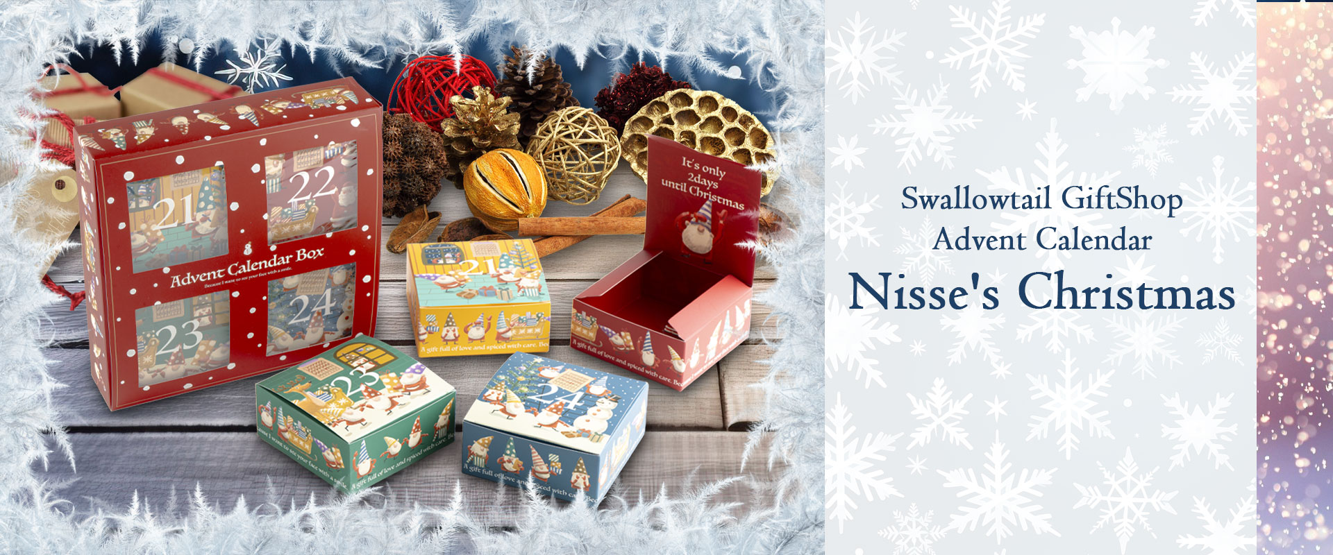 雪模様を施した赤のBOXからのぞく、愛らしいニッセが描かれたアドベントカレンダーです。